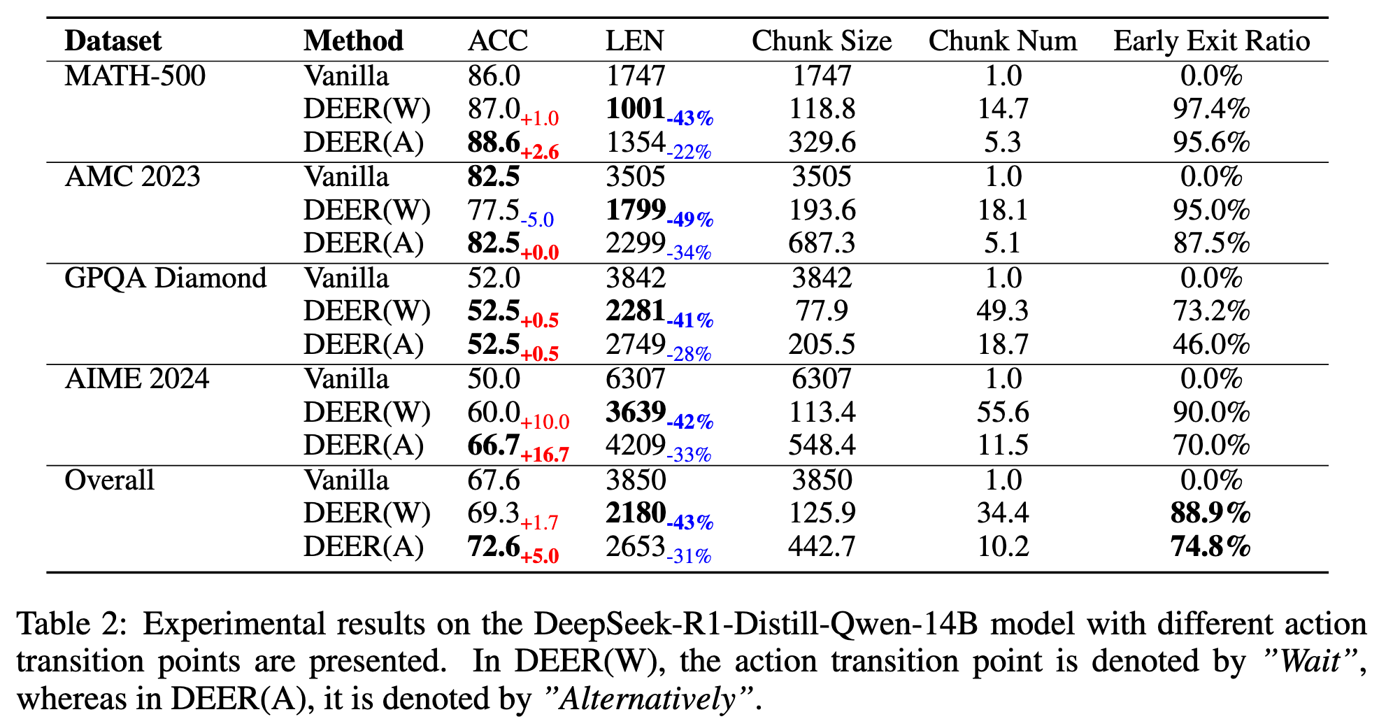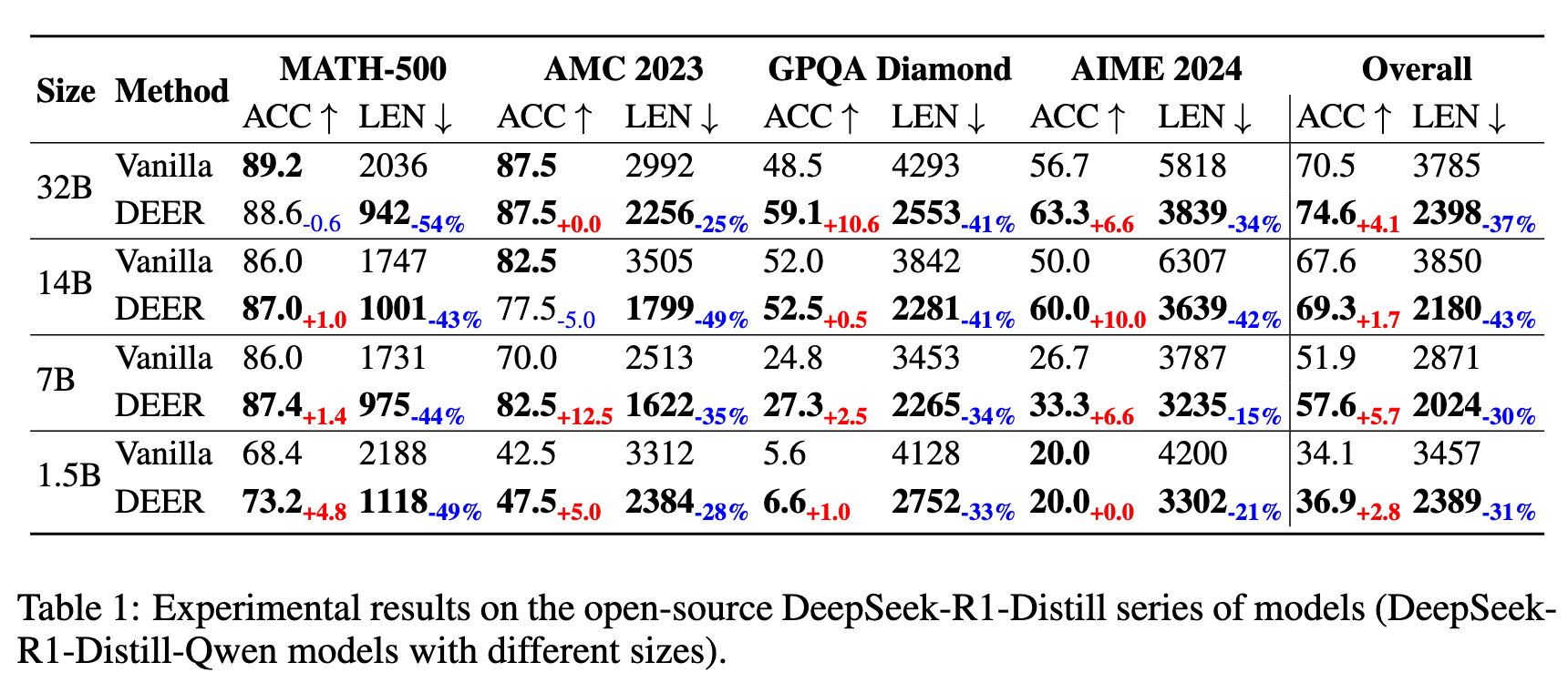 - 如果 DEER 能在红色样本上避免过早退出,在在 AMC23 上 7B 模型能打败 14B 模型,因此可以研究如何修改早停策略