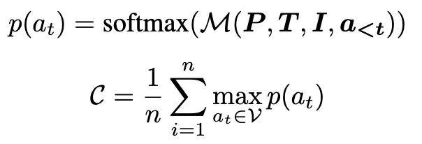 通过下面的公式计算 A 的置信度,下图中 M 为 LM Head 及其前置组件,以 logits 作为输出。