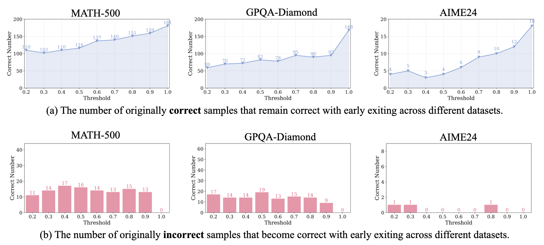 此外,还验证了一下原始推理是正确/错误的但是使用早停机制后正确的数量(Threshold 为 1.0 代表原始推理)