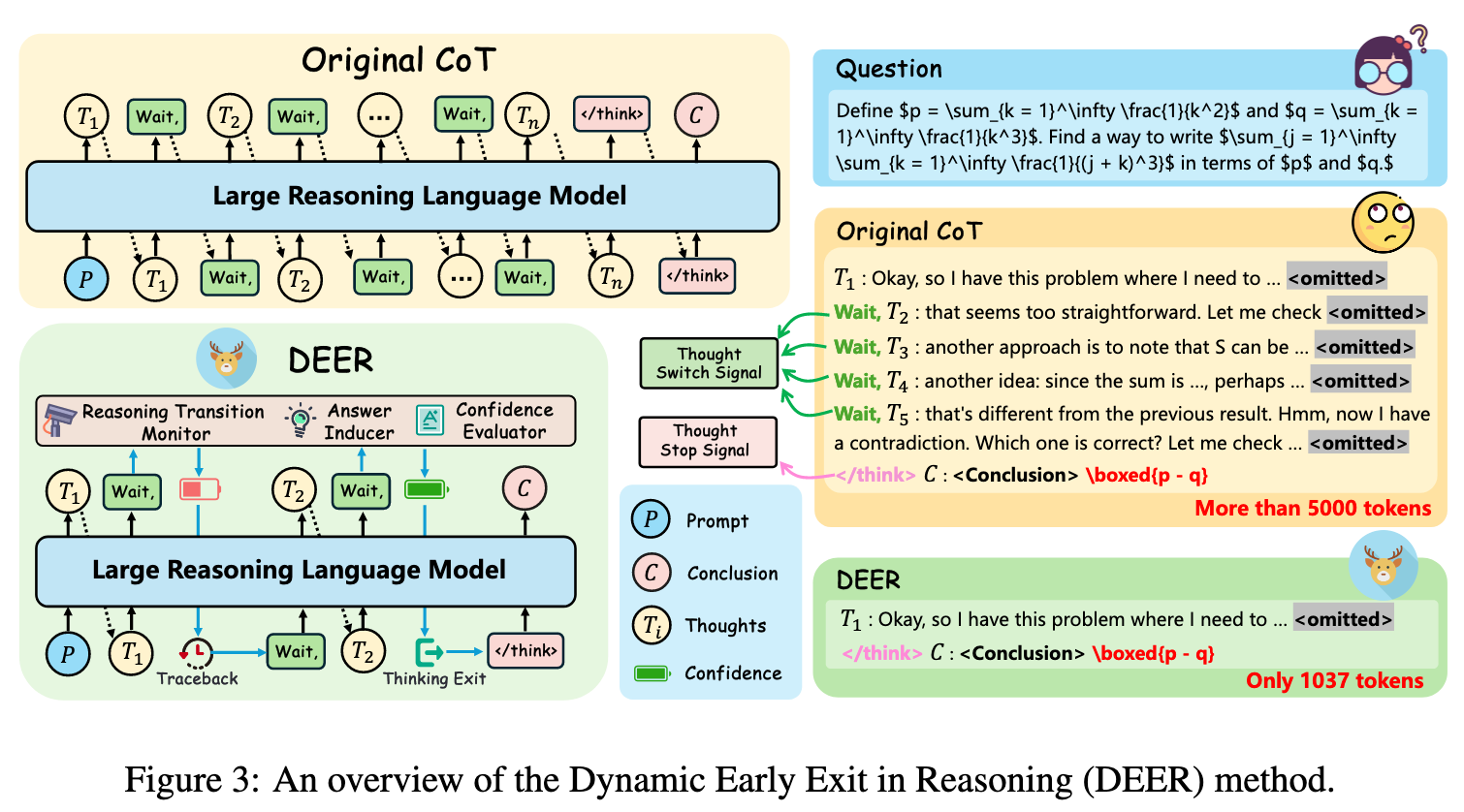 近期大型推理语言模型(LRLMs)的进展依赖于测试时扩展,这将长链条思维(CoT)生成延伸以解决复杂任务。然而,过长的 CoT 不仅会降低问题解决的效率,还可能因过于详细或冗余的推理步骤而导致准确性损失。我们提出了一种简单而有效的方法,允许大型语言模型(LLMs)在生成过程中通过早期退出机制自我截断 CoT 序列。与依赖固定启发式规则不同,所提出的方法在潜在的推理转换点(例如,“Wait” tokens)监测模型行为,并在模型对试探性答案表现出高置信度时动态终止下一推理链的生成。我们的方法无需额外训练,可无缝集成到现有的类似 o1 推理 LLMs 中。在多个推理基准测试 MATH-500、AMC 2023、GPQA Diamond 和 AIME 2024 上的实验表明,所提出的方法在 deepseek 系列推理 LLMs 上始终有效,平均将 CoT 序列长度减少 31% 至 43%,同时将准确性提高 1.7% 至 5.7%。