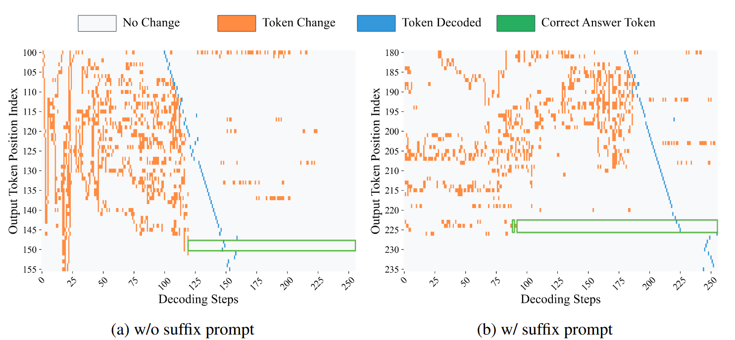 - 作者添加了后缀提示“Answer”,显著提高了早期 decoding 的效果,在在随机 remask 下,25% 的步骤已经可以正确 decoding 出 94.6% 的 token 了