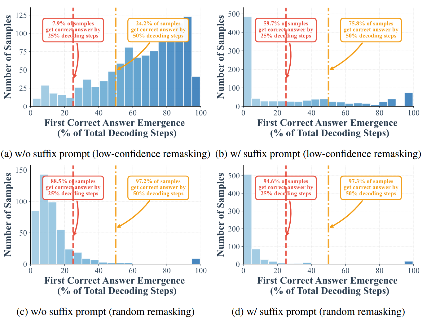 - 在解码的早期阶段,可以正确解码的样本比例较高。对比图 1(a)和图 1-(c)表明,使用低置信度 remask 时,前一半的步骤中已经有 24.2% 的样本被正确 decoding 出来,前 25% 的步骤中已经有了 7.9% 的样本被正确 decoding 出来。但是如何换成随机 remask,前一半的步骤能正确 decoding 出 97.2%,前 25% 步骤能正确 decoding 出 88.5%